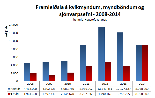 Hagstofan var að gefa út veltutölur yfir fyrstu 6 mánuði ársins. Veltan í skattflokknum „Framleiðsla á kvikmyndum, myndböndum og sjónvarpsefni“ hefur meira en tvöfaldast á milli ára og er velta ársins orðin jöfn veltu alls ársins 2011.